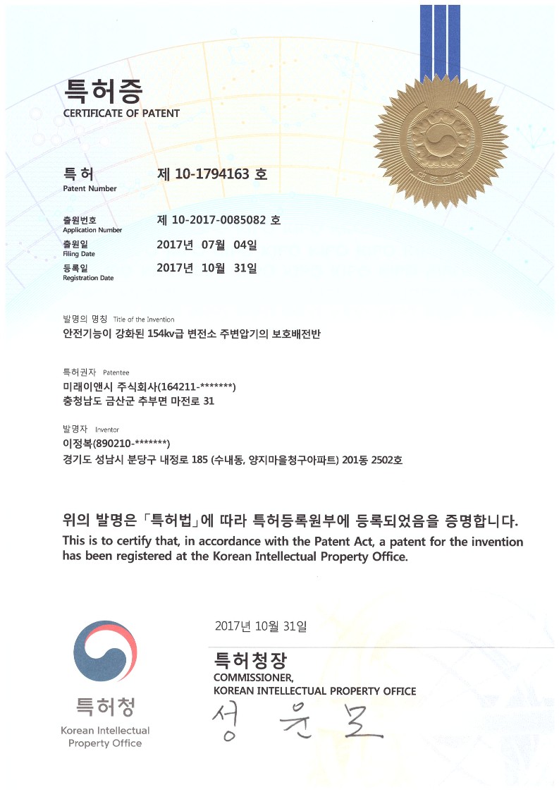 특허 제 10-1794163호 안전기능이 강화된 154kV급 변전소 주변압기의 보호배전반 특허소개 특허 제 10-1794163호 안전기능이 강화된 154kV급 변전소 주변압기의 보호배전반